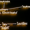 Description: a partial image of a etymology tree for the Indo-European word 'leuk done in white neon on black'; in the lower left is